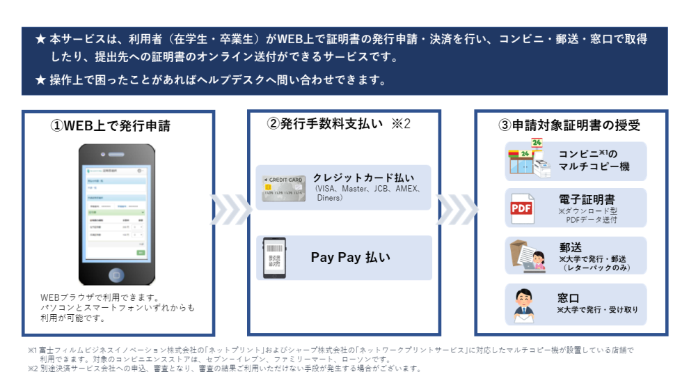 - 証明書発行サービス申請後のキャンセル等による返金は一切対応できません。 必ず事前にご確認ください。