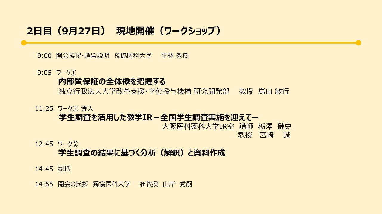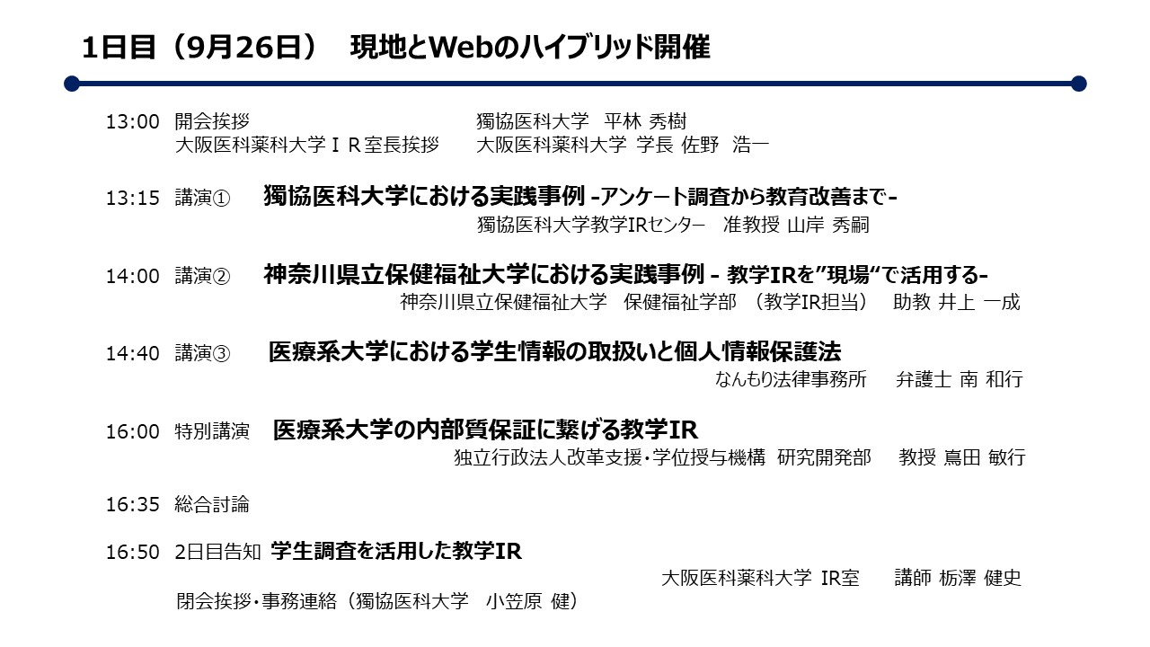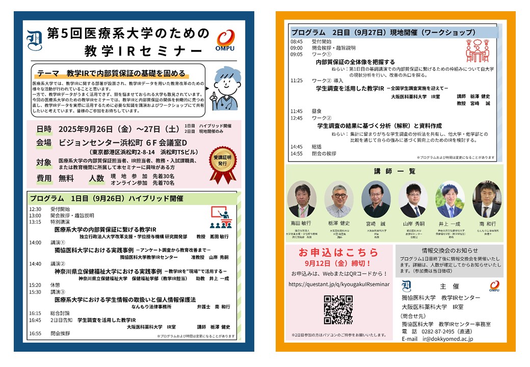 対 象:医療系大学の内部質保証担当者、IR担当者、教務・入試課職員、または教育機関に所属して本セミナーに興味がある方