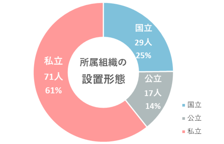 ※主催・スタッフ2名除く 117名 割合の高い順に、「私立」61%(43校)、「国立」25%(16校)、「公立」15%(11校)でした。