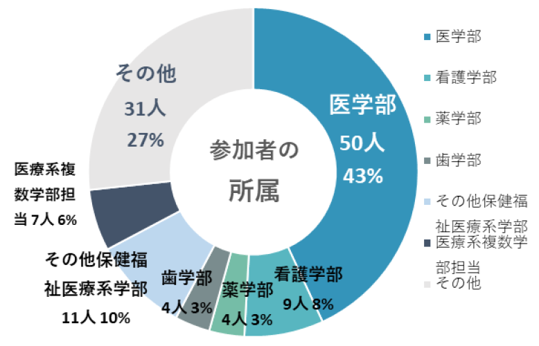 ※不明1名、主催・スタッフ2名除く 116名 割合の高い順に、「医学部」43%、「その他保健福祉医療系学部」10%、「看護学部」8%、医療系複数学部6%、