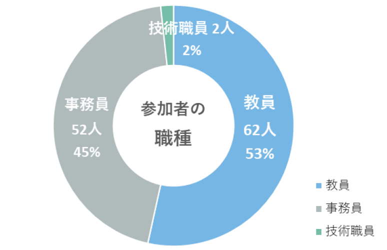 ※不明1名、主催・スタッフ2名除く 116名 参加者の職種の割合についてみると、「教員」53%、「事務員」45%、「技術職員」2%でした。