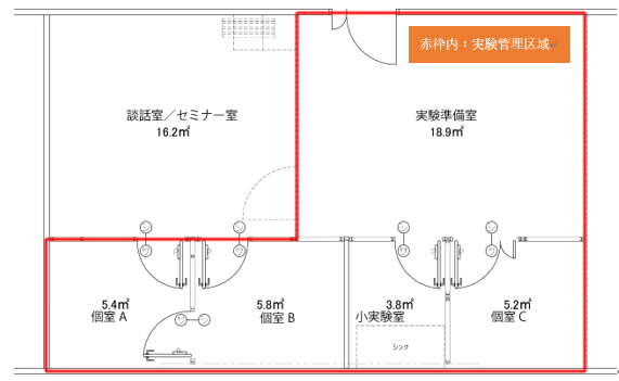 本スペースは、大学施設の目的に照らし、主として研究活動等を行うための場として整備されています。研究活動等には、試料調製、試薬操作、機器測定等のウェット実験、解析・データ処理等のドライ作業、研究打合せ、資料作成、技術説明、機器デモンストレーションおよびこれらに付随する意見交換等を含みます。