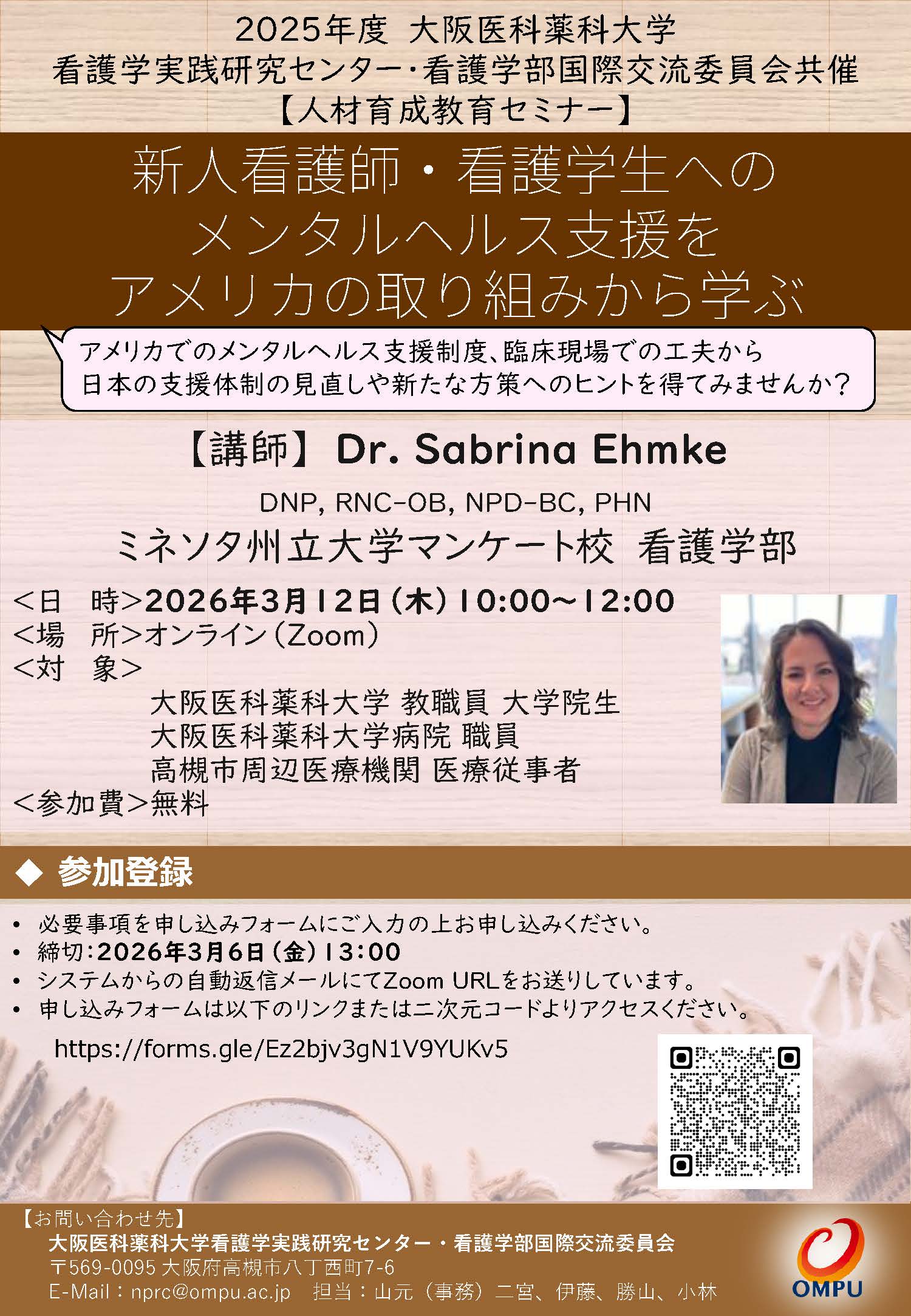 2026年3月12日(木)看護学実践研究センター・看護学部国際交流委員会共催にて【人材育成教育セミナー】を開催いたします。詳細はリーフレットをご確認下さい。