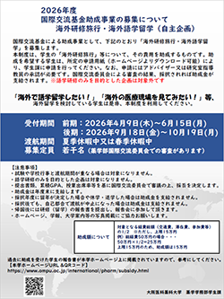 国際交流基金助成事業により、海外学術交流協定大学への留学、海外研修旅行・語学留学、国際学会発表等に対して渡航費用等への一部助成がありますので、ぜひ、本事業を活用してください。