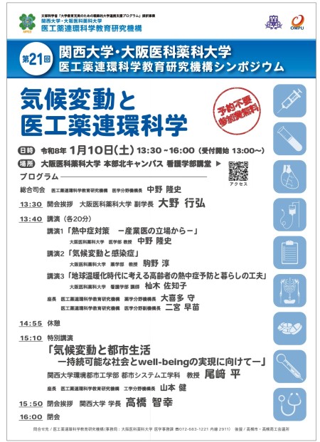 当日は、大阪医科薬科大学医学部、看護学部、薬学部の3学部の教員による一般講演、関西大学 環境都市工学部 都市システム工学科 尾﨑 平 教授による特別講演予定しています。