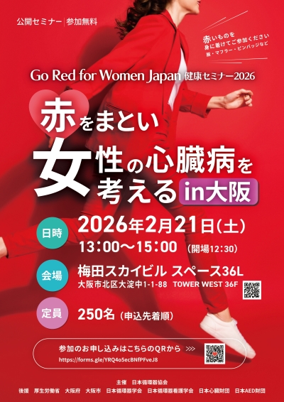このたび日本循環器協会は、AHAのサポートのもと、Go Red for Women Japanのイベントとして健康セミナー2026「赤をまとい女性の心臓病を考える」を東京および大阪で開催いたします。