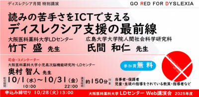 本学LDセンターも広島大学大学院人間社会科学研究科の氏間和仁先生と本学LDセンターの竹下盛先生による、「【ディスレクシア月間 特別講演】で読みの苦手さをICTで支える ーディスレクシア支援の最前線ー」を開催し、無料公開します。