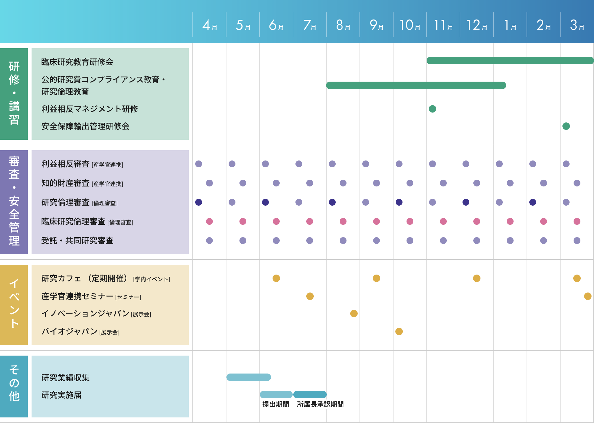 このカレンダーは研究活動を支援する研修・講習、審査、各種安全管理手続き、 および学内イベントの年間スケジュールを掲載しています。 研究を進めるうえで必要な手続きや研修の実施時期を一覧で確認でき、 計画的な研究活動に役立てていただけます。 詳細は各制度・各イベントの案内ページをご参照ください。