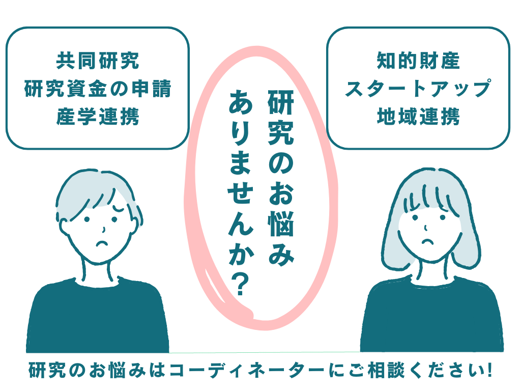 研究資金を獲得したい、企業との共同研究に挑戦したい、特許の出願に興味がある、あるいは大学発スタートアップとして研究成果を社会に広げたい——そんな産学官連携にまつわる様々なお悩みやアイデアをお持ちの皆さまは、ぜひ本学の産学官連携コーディネーターにお気軽にご相談ください。