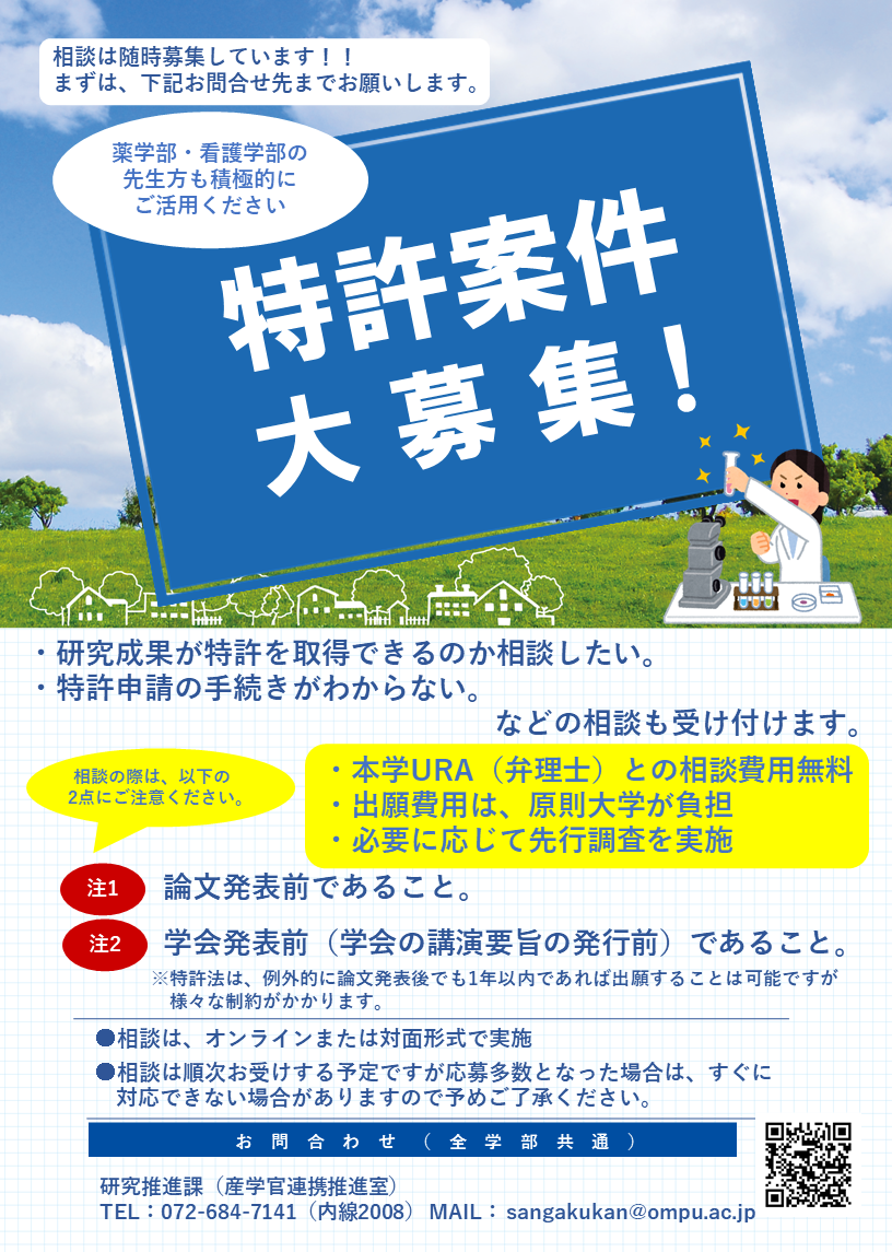 そんな場合でもご安心ください。URAや産学官連携コーディネーターが、アイデア段階の相談から出願手続き、企業との連携支援まで、わかりやすく丁寧にサポートいたします。