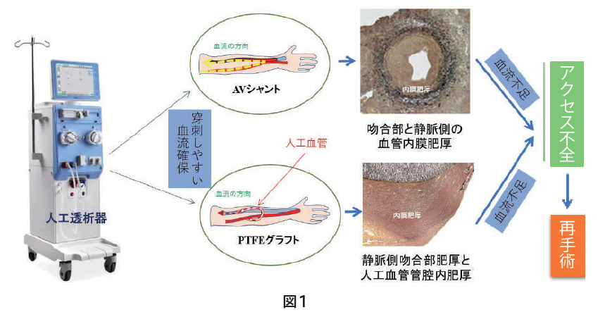 近年、腎透析レベルの向上によって末期腎不全患者のライフスパンが十数年から数十年も延長されている。透析患者は週3回血液透析を行わなければならない。短時間の透析で効率よく血液を浄化するには穿刺しやすく、かつ血流量の豊富な血管の確保が不可欠である。そこで、透析患者には通常動静脈シャント術(内シャント)あるいは動静脈間PTFE人工血管移植術(人工血管グラフト)が施される(図1)。しかし、このように作製されたバスキュラーアクセスのいずれも、その後の血管内膜肥厚による内腔狭窄によって充分な血液量が確保できず、新たなバスキュラーアクセスルートの作製が強いられるようになる。近年、本邦におけるこのような再建術に使われる医療費が年々上昇し、医療保険制度に多大な負担をかけているだけではなく、患者における肉体的と経済的な損失も非常に大きい。しかし、バスキュラーアクセス不全に対する有効な治療法などが未だに開発されていないのが現状である。