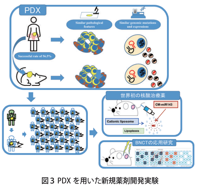 PDXでは、子宮頸癌、子宮体癌での生着率は約50%で、原発腫瘍の病理組織学的な特徴を反映し、同様のDNA変異やRNA発現、タンパク発現を有していることを証明してある。さらに、放出される細胞外小胞も類似していることを確認してある。また、腹水、胸水などの体腔液からのPDX作成にも成功しており、新規薬剤のターゲットとなる遺伝子異常やタンパク増幅あるいは特定の表面抗原を有している腫瘍などに合致するPDXがあれば、複製し実験に用いることができる。現在、子宮癌PDXを用いて、新規核酸治療薬の開発、BNCTの研究が進められている。(図3)