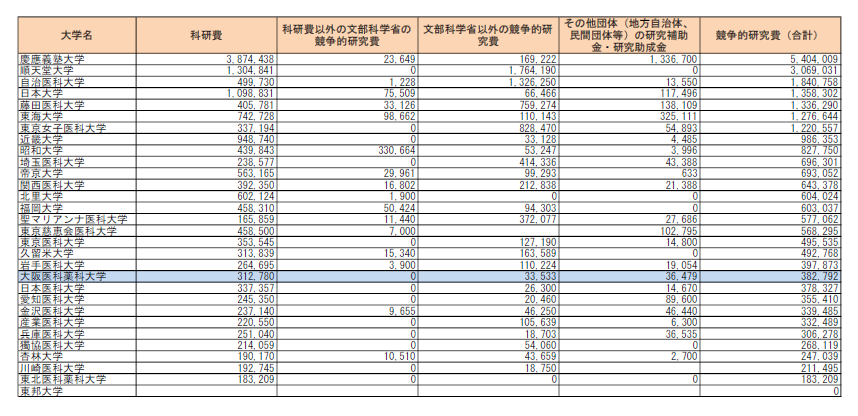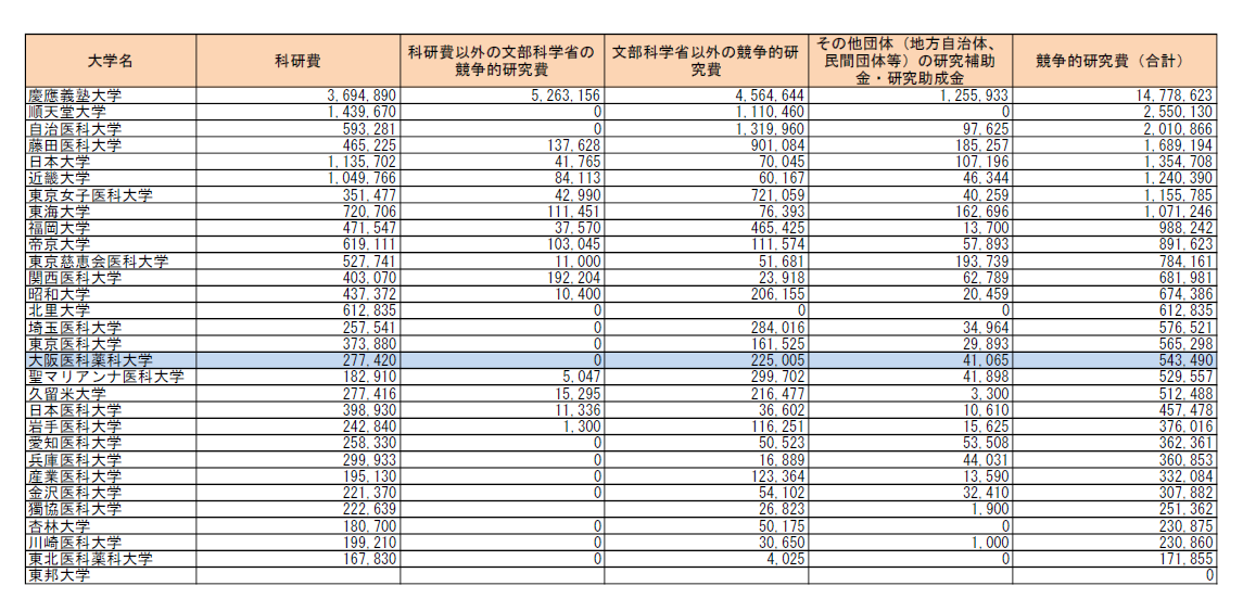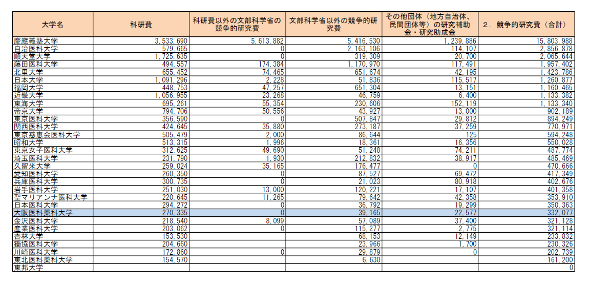 競争的研究費(合計)受入額の降順になっていますが、大学により教員数、学部構成が異なるので金額だけの単純な比較には注意が必要です。