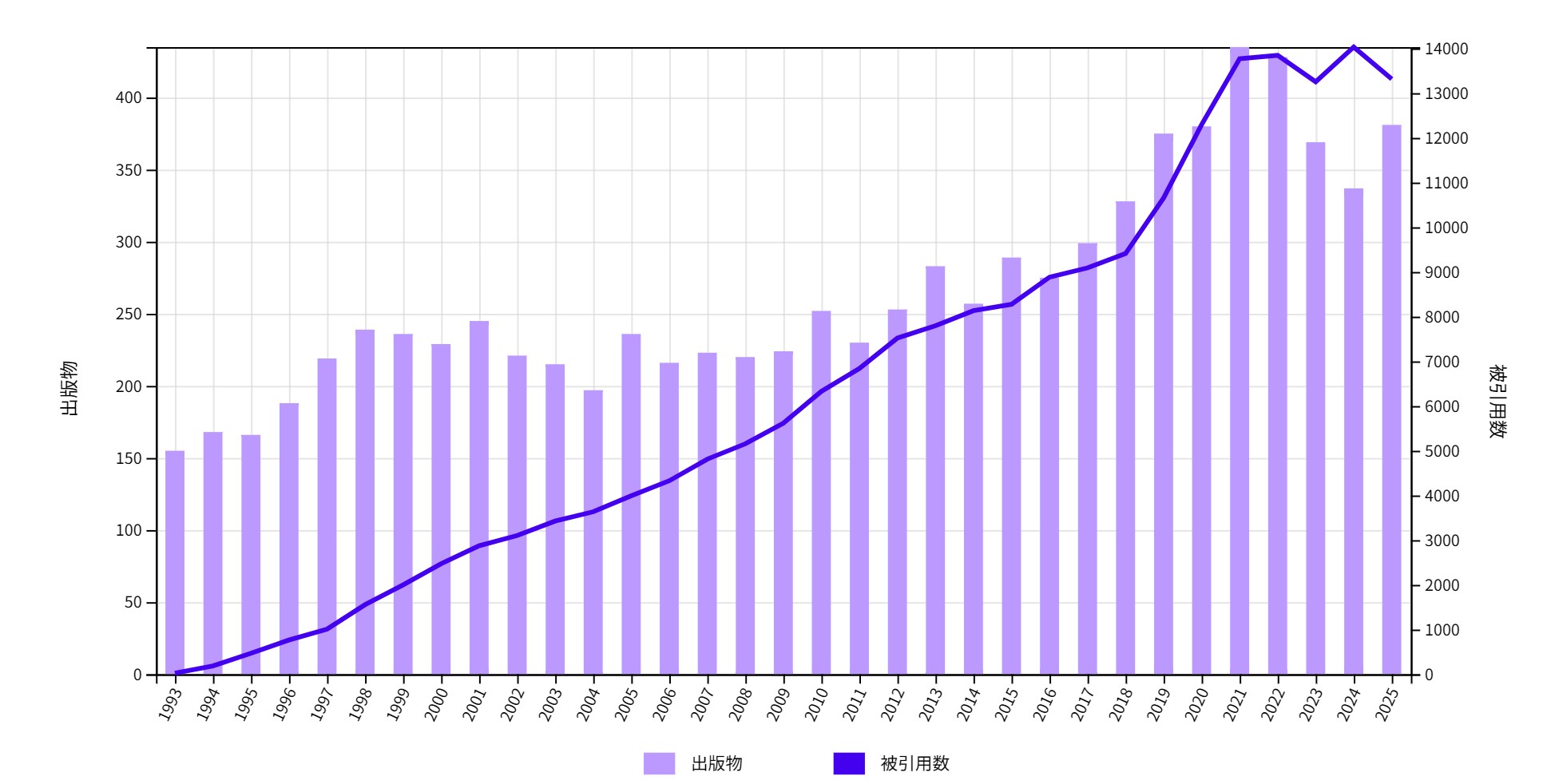 論文数:研究者や研究機関が発表した学術論文の総数を示す指標で、研究活動の量的側面を表します。ただし、数の多さは必ずしも質を保証するものではありません。