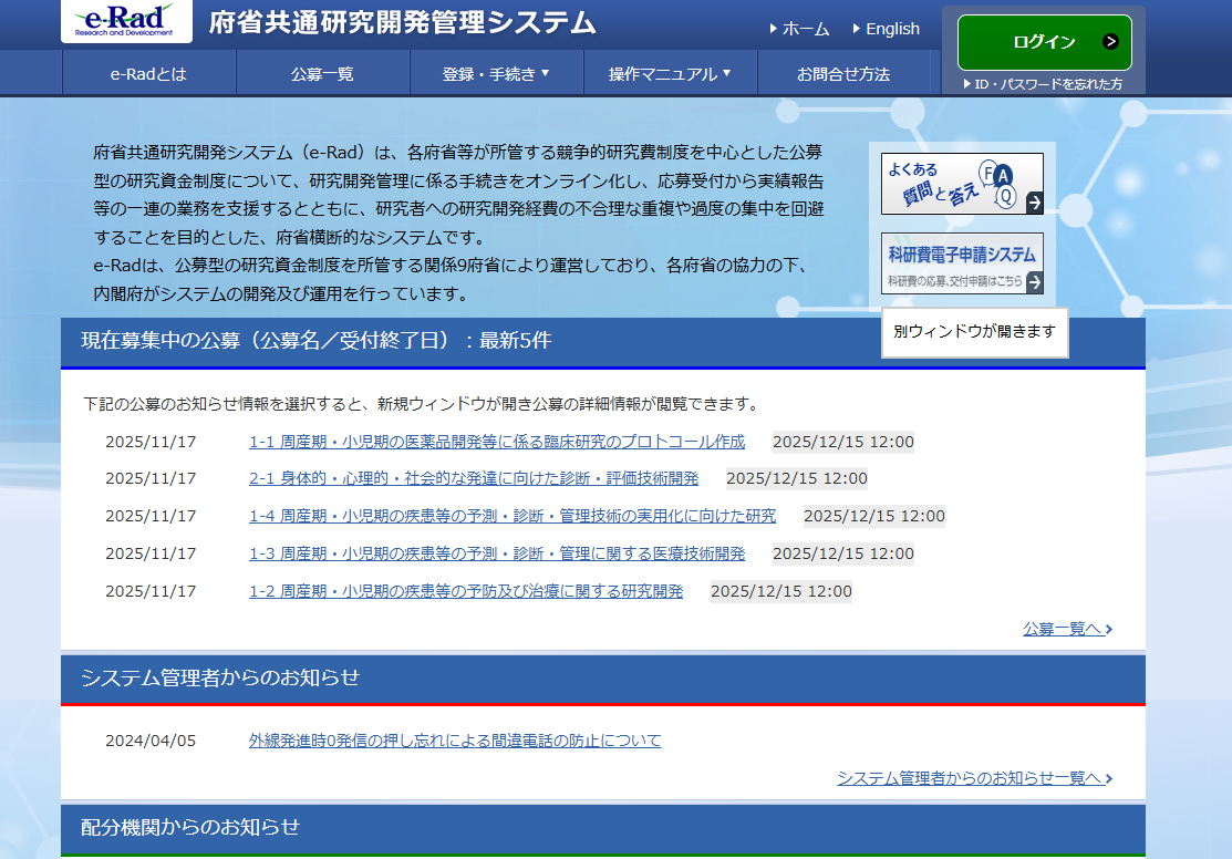 科研費等の公的研究費に応募をするにはe-Rad に事前に登録されていなければなりません。
