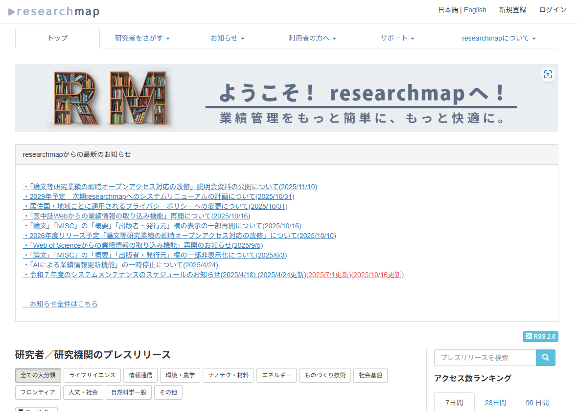 researchmapは、研究者が業績を管理・発信できるようにすることを目的とした、国が提供するデータベースです。