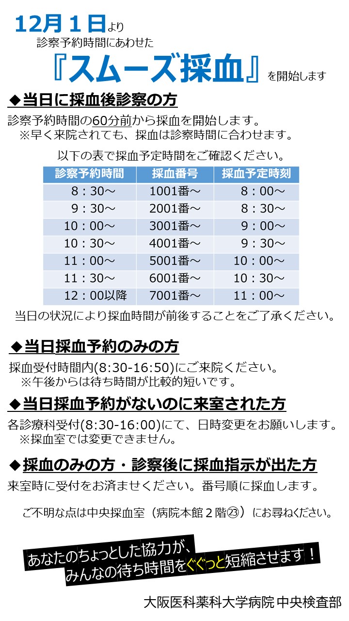 ※8:30〜16:50にご来室ください。混雑の少ない午後の採血をおすすめします。