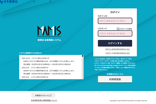 日本医師会・大阪府医師会・大阪医科薬科大学医師会の手続きは同時にできます。 医師会会員情報システム(MAMIS)が2024年10月より稼働し、Web上で諸手続きができるようになり、従来の複写式用紙を用いた手続きは終了いたしました。